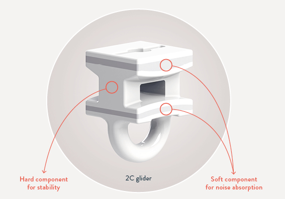 The premium 2C gliders and rollers (patent pending), combined with the specially coated tracks allow the curtain to move smoothly and silently. These gliders are manufactured using two materials, a hard component which ensures stability and a soft ‘filling’ to absorb the noise. The end result is unprecedented silence.